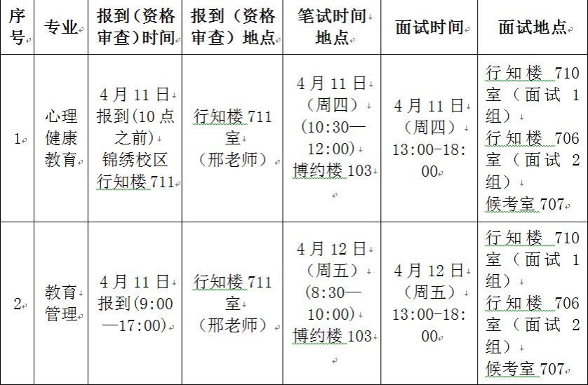 面试时间地点见表1。需提前30分钟,到行知楼711签到,抽取试讲题目,并到候考室进行30分钟备课。