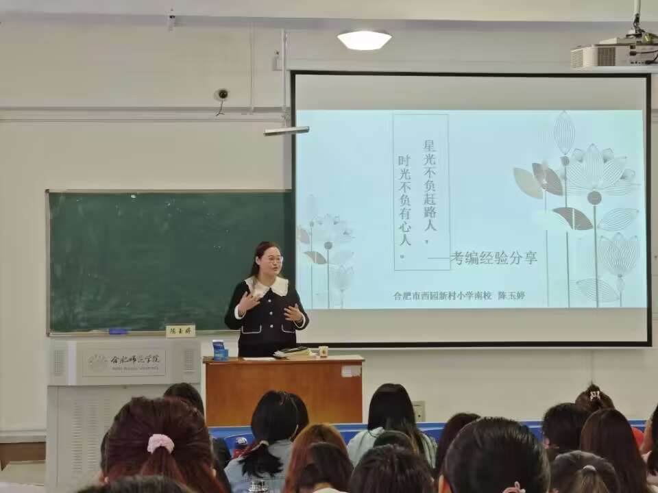 本网讯 9月23日上午,AC米兰中文官网在锦绣校区逸夫楼A106教室举行2021级小学教育专业考编经验分享会,学院邀请2020届毕业生、合肥市西园新村小学南校教师陈玉婷分享考编经验、进行实习指导。AC米兰中文官网2021级小学教育专业(非定向)学生参加了分享会,教育系副主任唐银主持会议。