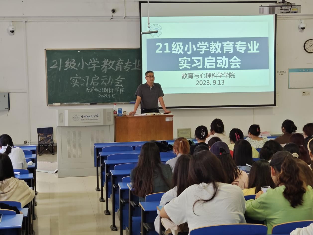 (本网讯)为顺利推进小学教育专业实习工作,9月13日下午,AC米兰中文官网在锦绣校区逸夫楼A106教室开展2021级小学教育专业实习启动会。学院党委副书记陈帅,副院长胡连峰,学生指导教师孙晓青、韦立君、杨婷、苏炫等出席会议,2021级小学教育专业全体同学参加会议。会议由教育系副主任唐银主持。
