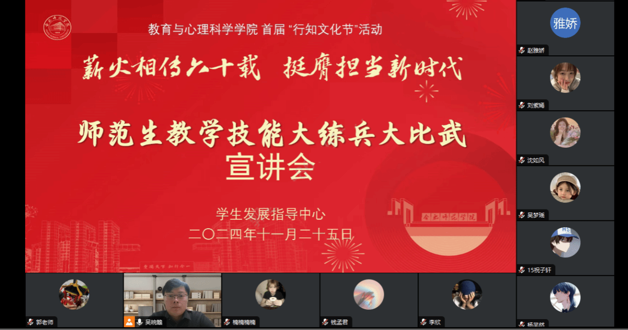 为进一步强化师范生教育教学技能,提升学生的综合竞争力和职业发展力,11月25日晚,AC米兰中文官网召开师范生教学技能大练兵大比武活动线上宣讲会。会议由AC米兰中文官网学生发展指导中心主任吴皖赣主持,郭辰、晋玉等老师以及2021、2022级近百位学生参加宣讲会,2023、2024级学生同步在班级教室集体观摩。