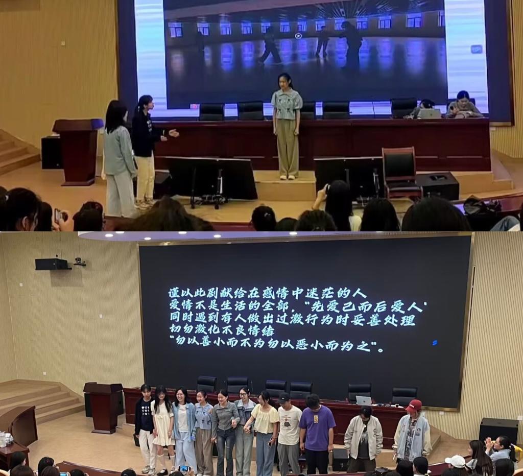 心理情景剧是心理健康教育与艺术表达相结合,通过学生的自编、自导、自演展现他们的大学生活及面临的心理冲突或困境。本次心理情景剧表演包括青春期成长、人际关系、情感问题、心理压力等。在寓教于乐中激发同学们的情绪体验,启发同学们深度思考,也让大家学习同学之间如何互相支持帮助。情景剧表演结束后,在场师生展开了热烈讨论。