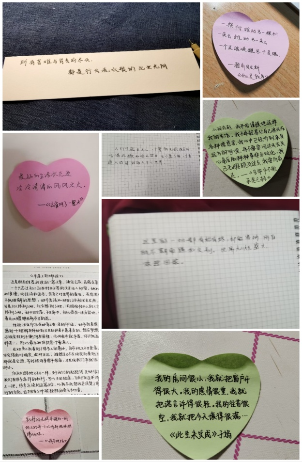 2023年4月22-24日,2020级学前教育班 “书香漂流进宿舍”主题活动顺利开展并取得良好效果。班上全体同学在便签纸上写下自己阅读过的书籍中令自己印象最深的一句话,并且标注了出自哪本书籍。那些记录下感触最深的文字的便签纸作为知识和情感的载体,在宿舍间相互传阅,激发同学们“好读书,读好书”的求知欲,营造良好的书香班级氛围。