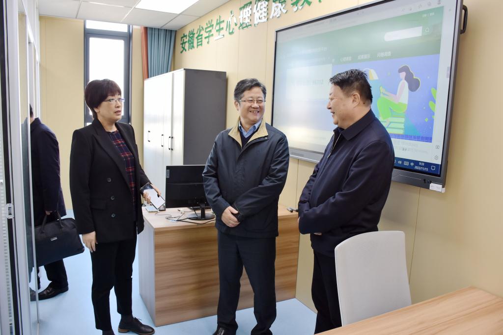 11月14日上午,安徽省委教育工委副书记王佩刚,省委教育工委委员、省教育厅副厅长解平率省教育厅基教处、学生处、学校安全管理处、思政处等一行8人,深入学院锦绣校区图书馆7楼安徽省学生心理健康教育管理平台现场考察调研,参观了心理健康中心,并召开建设工作推进会。学院党委副书记、院长方东玲,党委副书记梁立昌,平台项目负责人姚本先,党委委员、财务处处长常树宝,教师教育学院党政负责人、相关职能部门负责人及平台项目课题组和中电信数智科技有限公司等相关人员参加了会议。会议由方东玲主持。