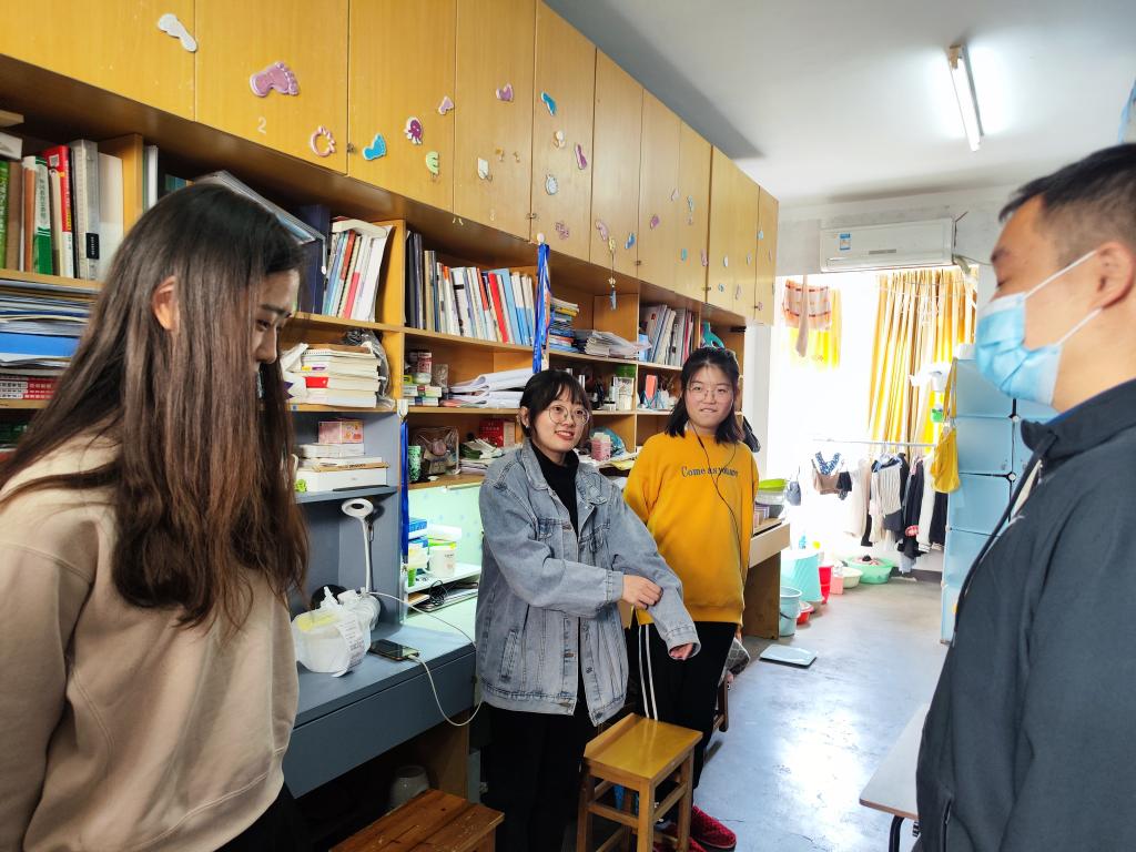 学院领导一行走进学生宿舍,与同学们亲切交流,询问和查看了同学们的线上学习和生活起居情况,进行了宿舍安全排查,并为同学们介绍了当下的疫情防控政策,认真听取了学生反映的意见和建议,现场予以一一解答。在学生宿舍中,穆娟勉励同学们要珍惜大学时光,不断学习,积极进取,认真学习好专业知识,努力拓展自身技能,虚怀若谷,志存高远。同时她也嘱咐同学们在特殊时期,要继续绷紧疫情防控这根弦,提高安全防范意识,注意加强体育锻炼,做好宿舍通风消毒,卫生清洁及个人健康监测。