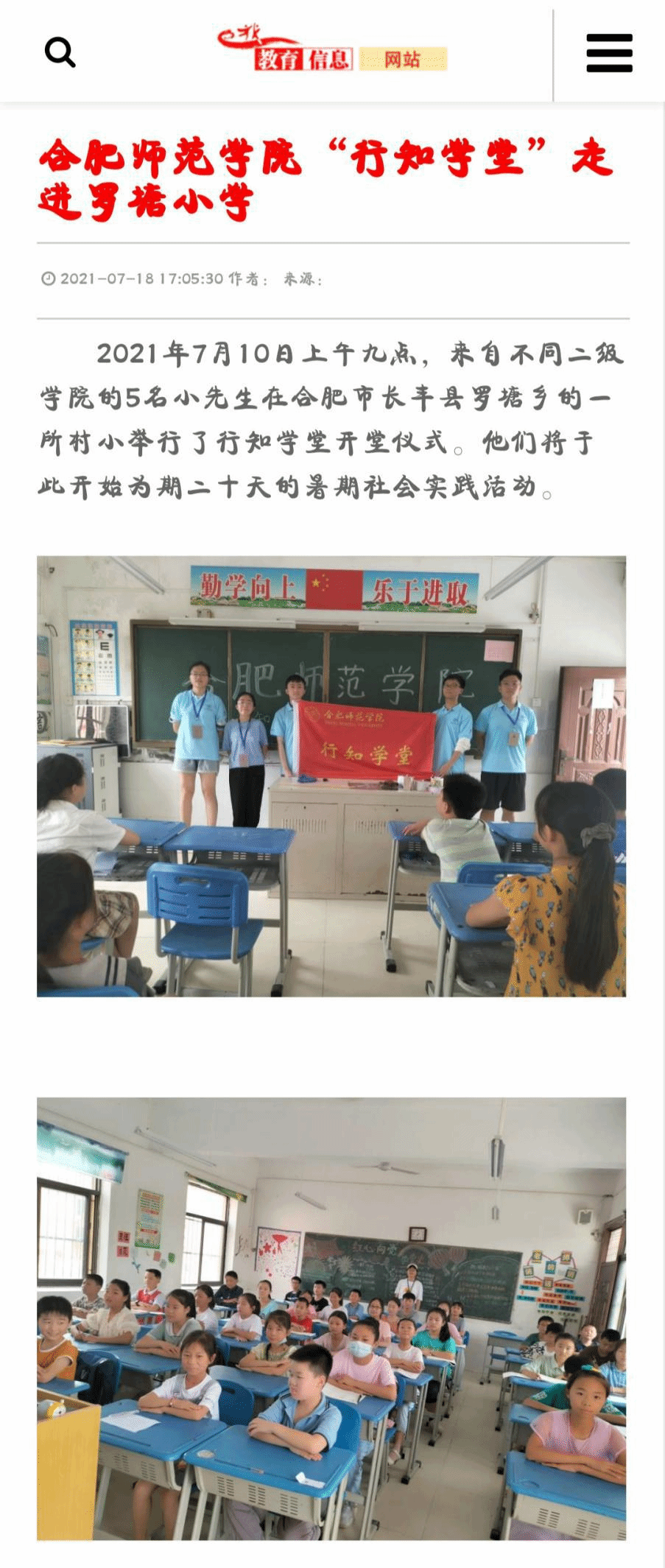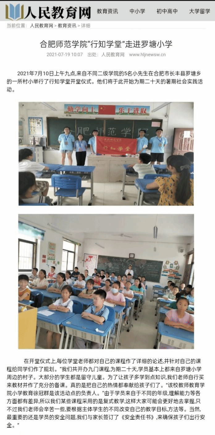 7月10日,教师教育学院“罗塘小学行知学堂”在合肥市长丰县罗塘小学顺利开班,小先生团队由我校教师教育学院、经济管理学院学院以及电子与信息工程学院共5名小先生组成。课程内容包括红色教育、安全教育、行知文化、扶志课程等。