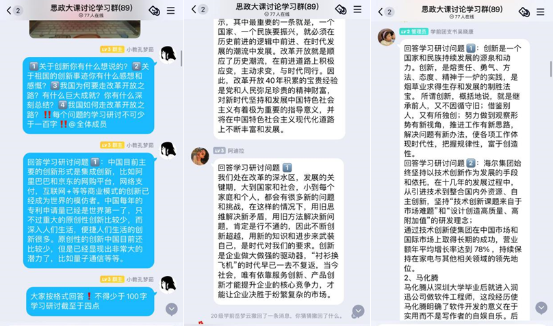 学前教育徐颖同学说:“自新中国成立以来,人民的生活质量随着经济的发展蒸蒸日上。这都是在中国共产党团结带领全国各族人民自力更生、艰苦奋斗来的成果。现如今,走进新时代,我们要继往开来,坚持对外开放的同时对内改革,促进我们的经济高质量发展。”小学教育二班王建同学表示:“习近平总书记在清华大学考察时就强调,广大青年要爱国爱民,不断增强做中国人的志气、骨气、底气,树立为祖国,为人民永久奋斗、赤诚奉献的坚定理想。今天聆听了3位教授的思政大课,真正从心底里感恩在不同历史时期一代又一代共产党人的牺牲与奋斗,倍感今天的一切都格外珍贵,唯有奋斗,才能青春无悔!”。