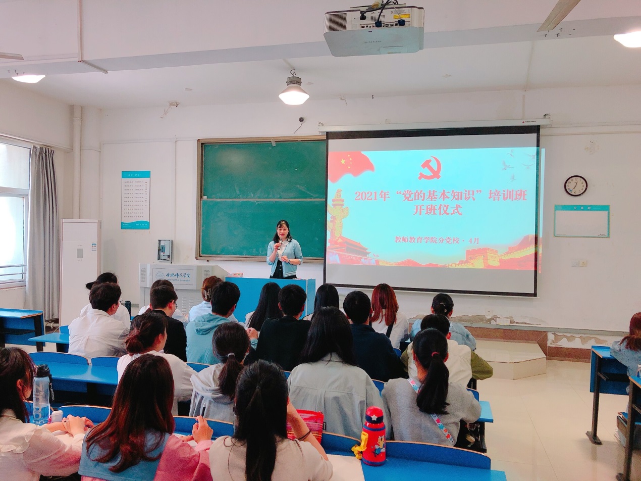 值建党一百周年来临、全党深入开展党史学习教育之际,为切实加强对入党积极分子和发展对象的教育培训,按照学校党委统一部署和学院党委总体规划,4月28日,教师教育学院在逸夫楼A105举行第46期“党的基本知识”培训班开班仪式。学院党委书记穆娟、培训班班主任邢文静出席开班式,教师教育学院锦绣校区入党积极分子、发展对象共66人参加培训。