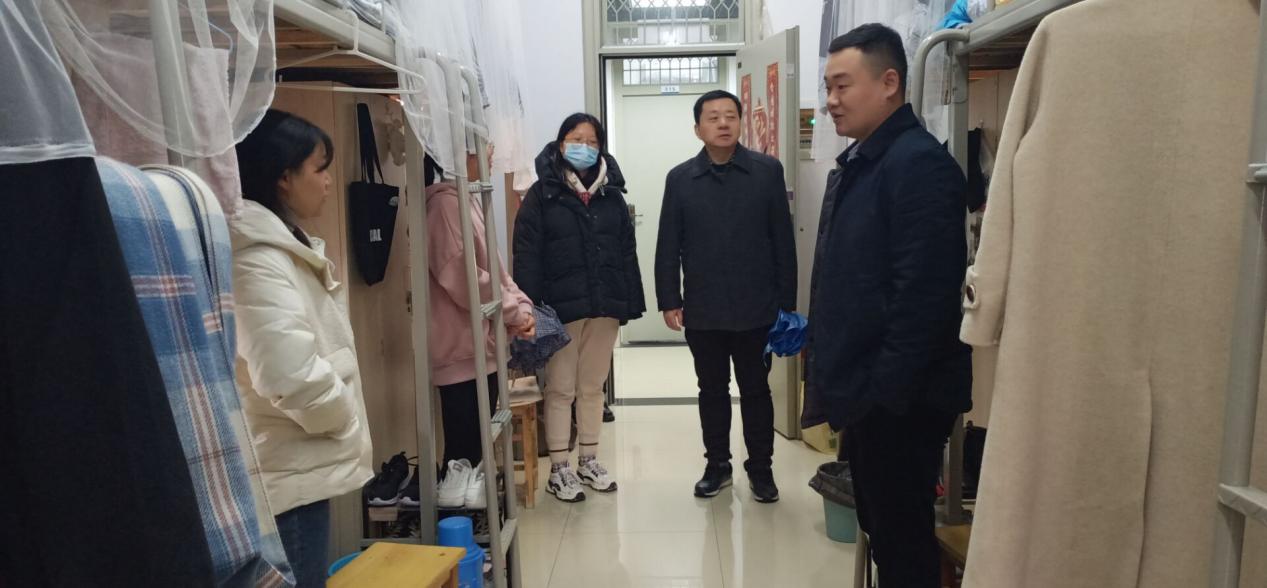 3月1日滨湖校区学生返校,王东明带领辅导员王磊、唐淼到学生宿舍看望返校学生,为大家送去了新春问候,并与同学们亲切交谈,了解同学们的假期生活和返校情况,提醒同学们要尽快适应学校作息时间,早睡早起加强锻炼,要提早做好规划,打好专业基础,积极参加社会实践。在走访中,王东明还就宿舍安全问题做了强调,辅导员王磊就宿舍卫生情况和大功率电器使用情况进行了摸排,并及时对大家宣传了寝室安全知识。
