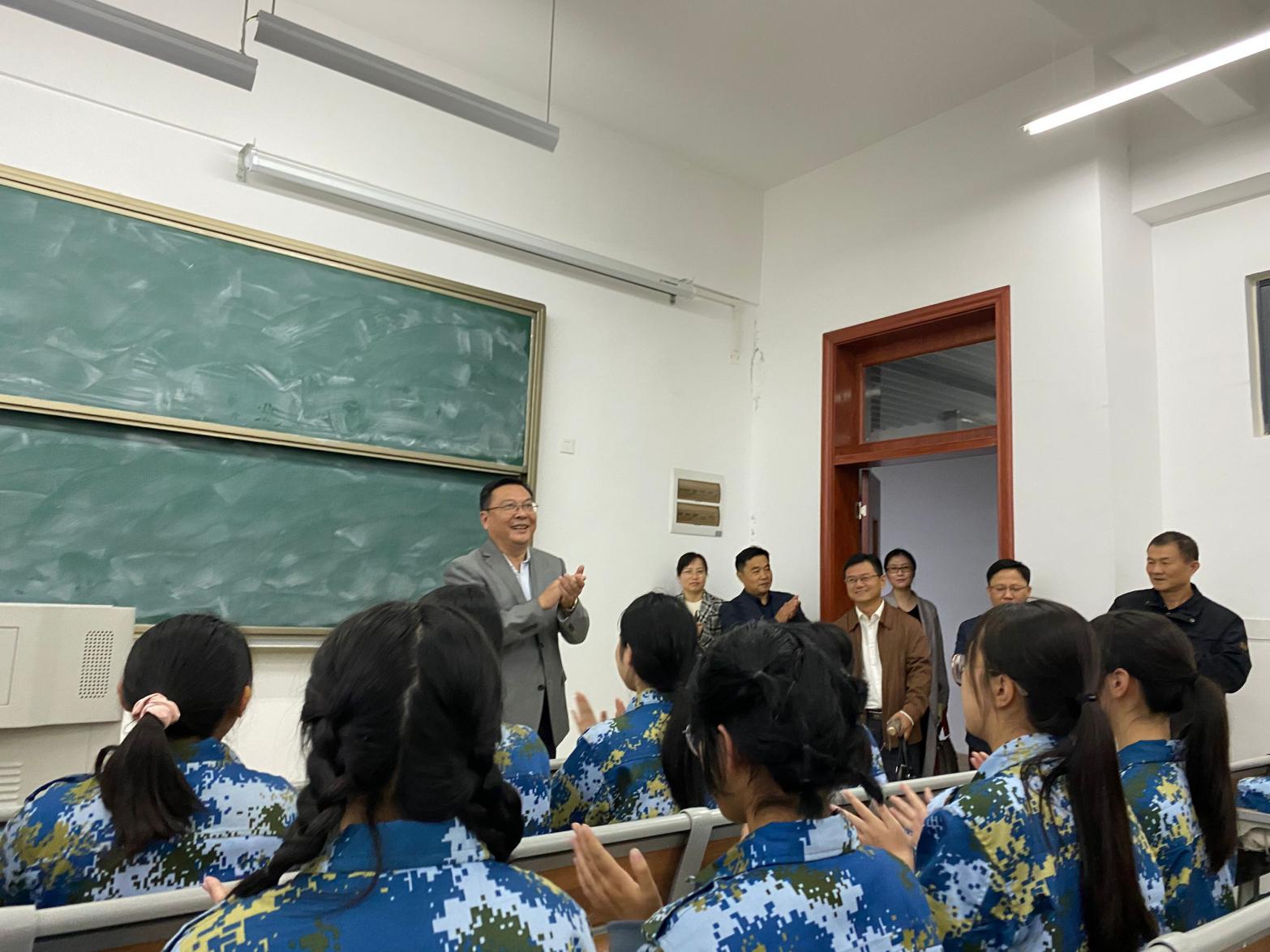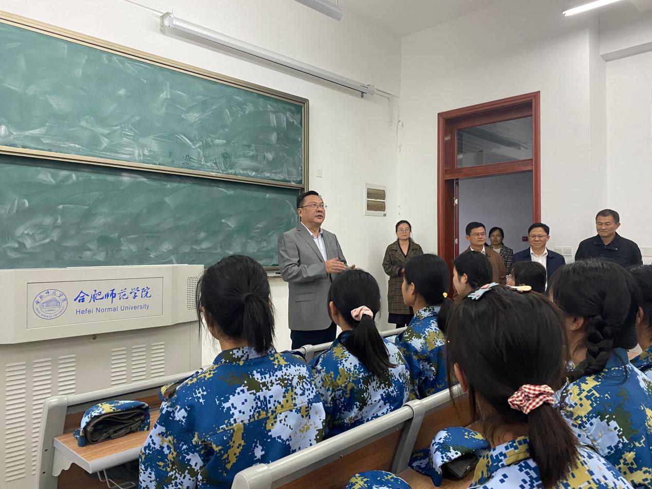 教师教育学院的新生以经久不息的掌声欢迎徐书记一行人的到来。“军训中的合师青年是一道亮丽的风景线。”徐成钢书记看到同学们挺拔的坐姿、整齐的着装、认真的态度,感叹道:“AC米兰中文官网又注入了一股新生力量”。他祝贺同学们迎来了一个崭新的人生阶段,军训是大学生涯中最值得珍惜和回忆的。通过军训,同学们不仅能学到国防知识,还能学习到人民解放军艰苦奋斗、吃苦耐劳,爱国奉献、不怕牺牲,勇敢顽强、坚韧不拔的优良革命传统。