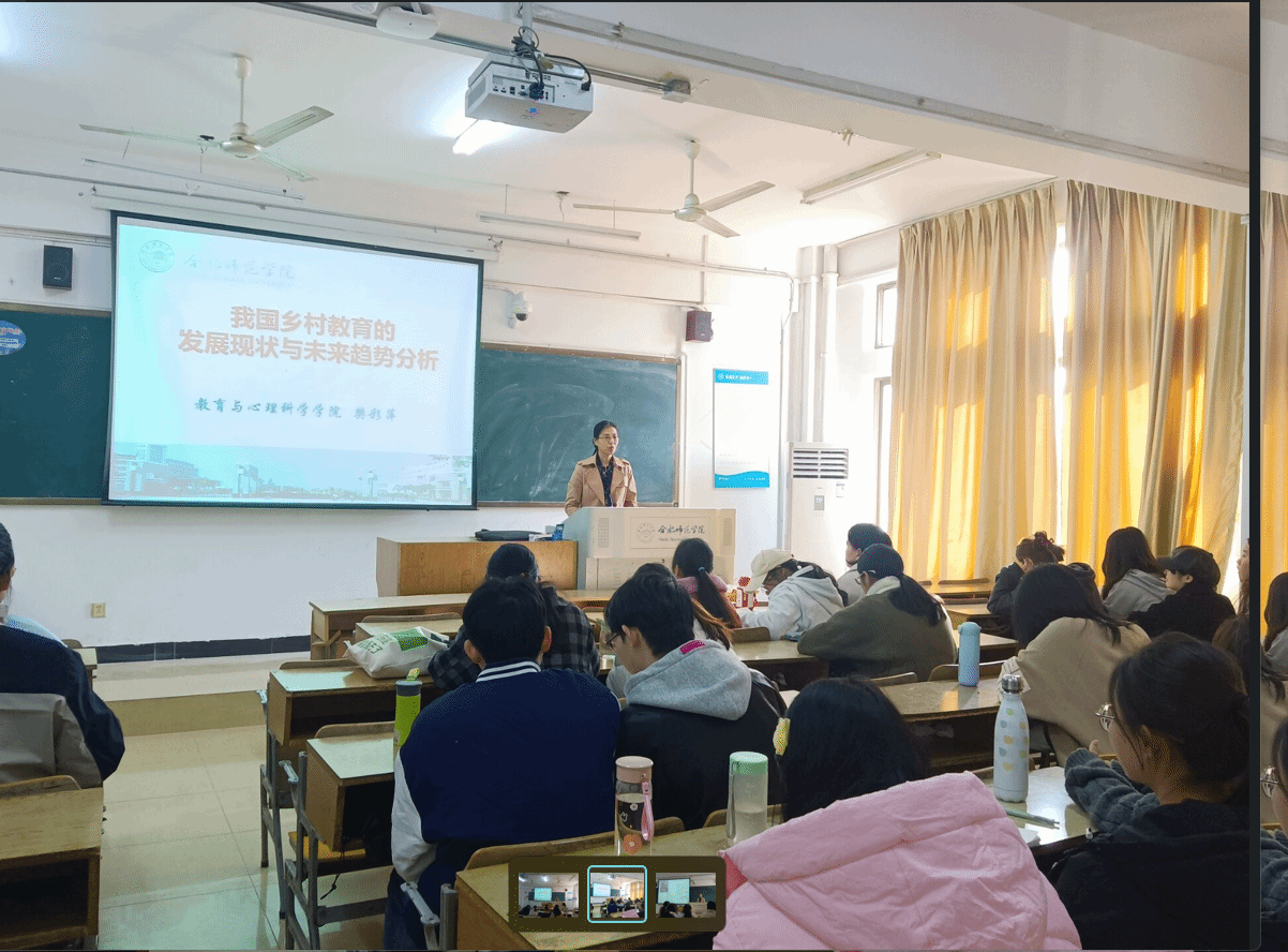 讲座中,樊彩萍从宏观角度切入,介绍了近十年来我国乡村人口、乡村学生、乡村学校、乡村班级的数量及增长速度,梳理了近年来我国关于大力发展乡村教育、大力加强乡村教师建设的相关政策文件,阐述了我国乡村教育在脱贫攻坚阶段、全面振兴阶段取得的发展成就,分析了当前乡村教育面临的困难与挑战、应对策略、未来的发展趋势。她指出提高乡村教育质量事关教育强国,发展乡村教育关键在教师,定向师范生是乡村教师队伍的重要补充,从事乡村教育工作,前路漫漫且艰苦,但这是一项崇高而幸福的工作,需要定向师范生未来以足够的信心、足够的能力,撑起乡村教育的一片天。