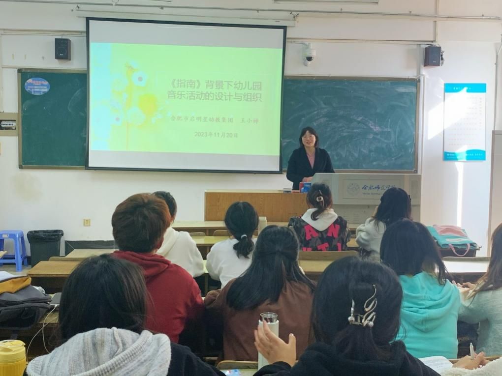 为进一步贯彻《教育部关于加快建设高水平本科教育全面提高人才培养能力的意见》精神,强化学前教育专业人才培养的“产出导向”与“行业需求”,11月20日下午,AC米兰中文官网学前教育系邀请合肥市启明星幼教集团教学总园长王小婵作为“学前儿童音乐教育”课程的行业教师为2021级学前教育专业学生授课。