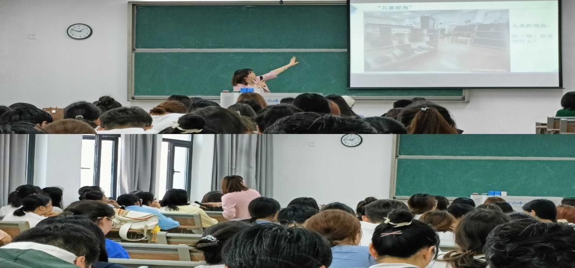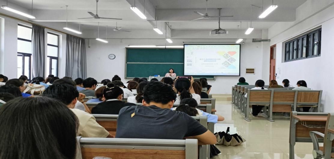 王小婵以热场小游戏为切入点,适时提出“什么是儿童视角?”,并与同学们进行现场讨论,学生们在轻松愉悦的氛围中积极分享了自己的看法。王小婵指出,儿童视角不应是成人借助于儿童的眼光或叙述口吻去审视自己的教育理念,而应让儿童来表达自己眼中的教育现象以及他们对教育的理解和看法。为进一步促进学生更好理解儿童视角,王小婵列举“小金豆诞生记”等大量实例进行说明。同时,王小婵还分享了幼儿园“预设+生成”课程实践模式,让学生们充分认识到应从幼儿生活出发,以幼儿发展的现实需要来促进幼儿成长,她强调在开展活动后一定要学会教学反思。