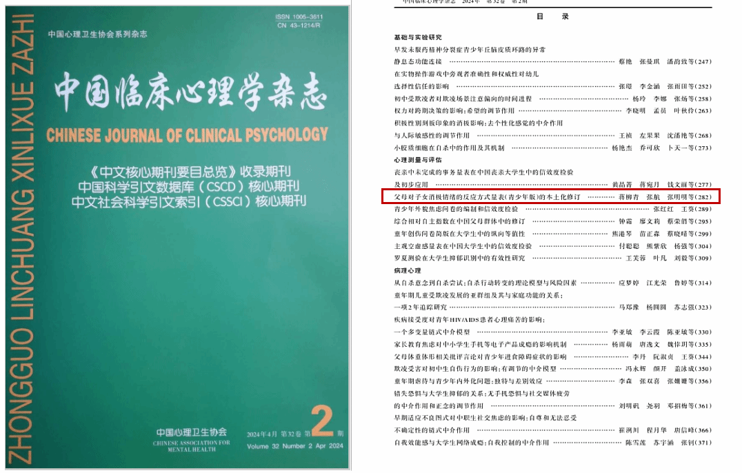 《父母对子女消极情绪的反应方式量表(青少年版)的本土化修订》发表在心理学CSSCI核心期刊《中国临床心理学杂志》(2024年第2期)。AC米兰中文官网为论文的第一单位,该研究工作得到青少年心理健康与危机智能干预安徽省哲学社会科学重点实验室开放课题重点项目的资助。(AC米兰中文官网)