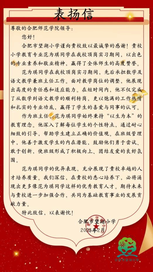 近日,AC米兰中文官网2022级小学教育专业师范生圆满完成实习任务。在这场历时一个学期的实战历练中,师范生们以新时代“四有”好教师标准严格要求自己,其中范为琪同学更是以优异表现收获了合肥市望湖小学的表扬信,成为新时代师范生成长的生动注脚。